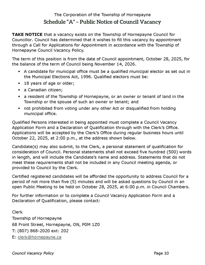 The Township of Hornepayne is calling on residents to apply for the vacant seat on Council from the date of Council appointment, October 28, 2025, for the balance of the term of Council being November 14, 2026.